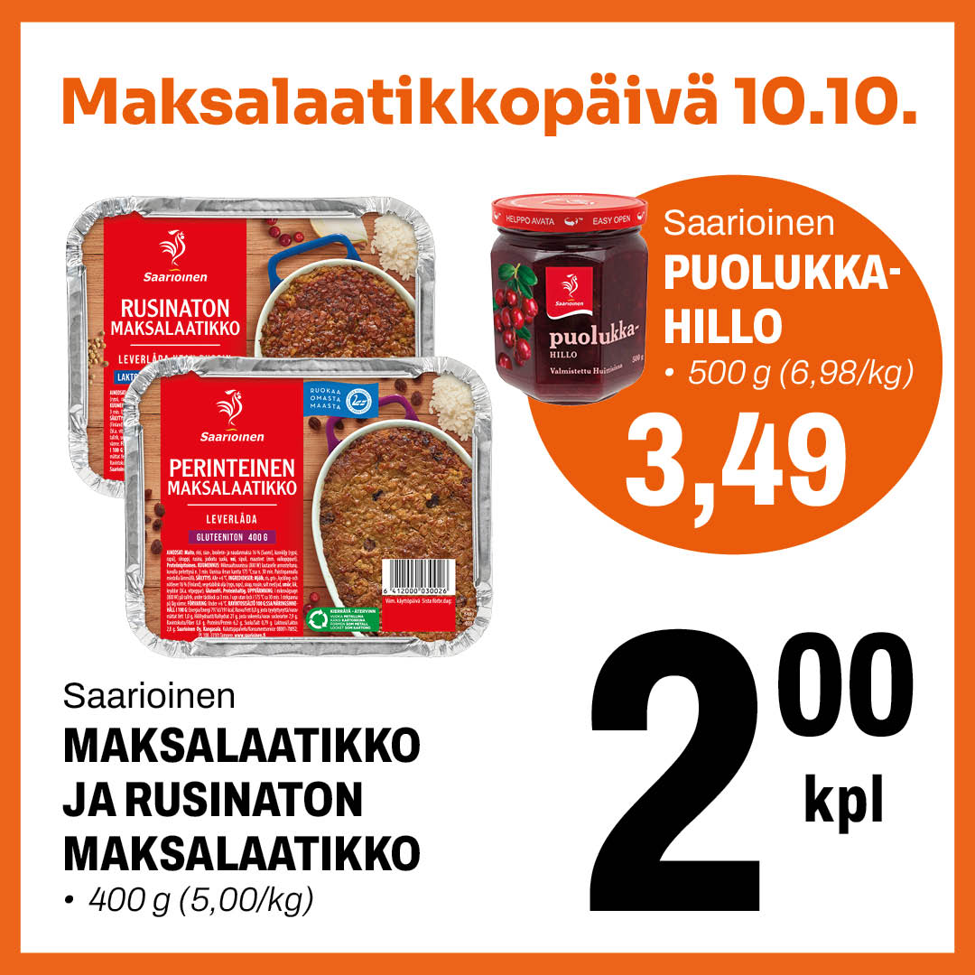 Tiesitkö, että vuonna 1957 Saarioisilla keksittiin ensimmäisenä Suomessa pakata tuotteet pieniin alumiinivuokiin? Tuolloin äitiemme äidit valmistivat niihin ensimmäiset maksalaatikot. Vaikka et juhlisikaan 10.10. kansainvälistä maksalaatikkopäivää, niin ei hätää – meiltä löydät herkut kaikkiin makuihin!